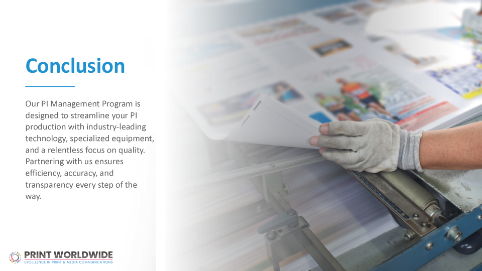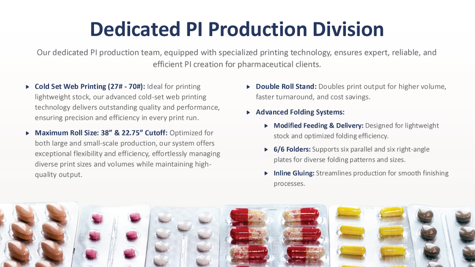 Our dedicated team and advanced printing technologies ensure reliable PI (Product Information) creation, with specialized equipment to handle pharmaceutical-grade production. Services include: